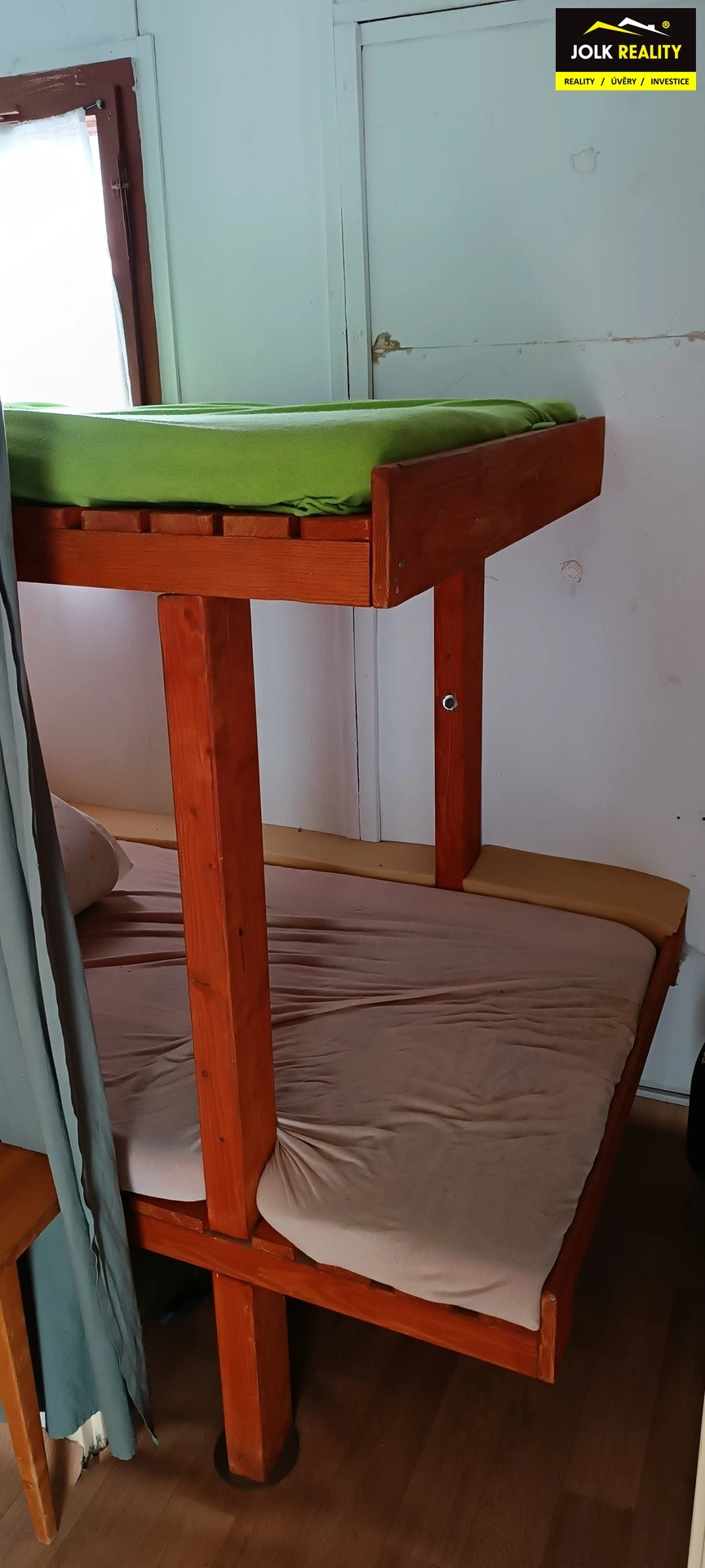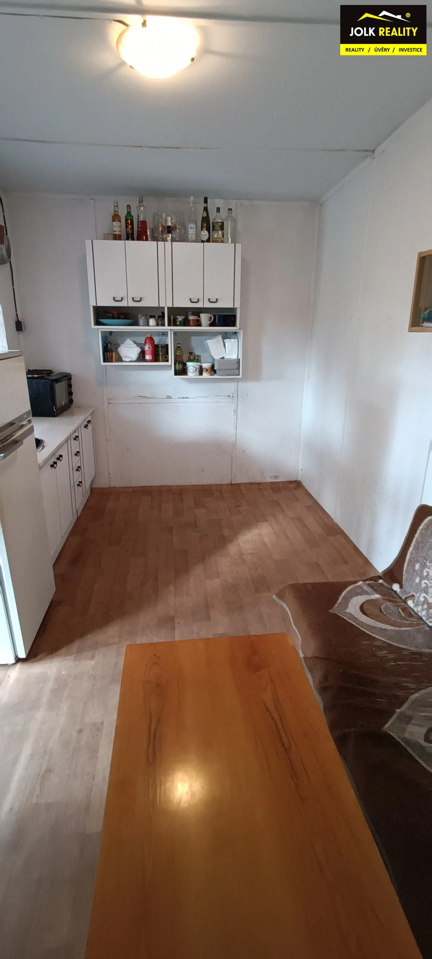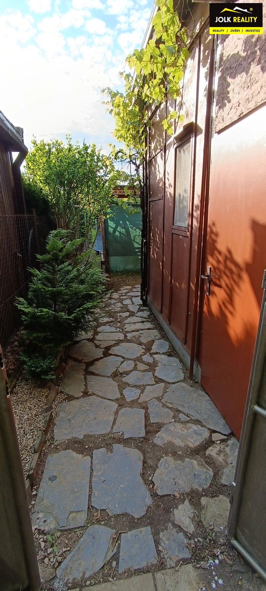 U vstupu na zahrádku je umístěna chatka s pergolou, krbem a dřevěnou houpačkou. V chatce se nachází kuchyňská linka včetně ledničky, multifunkční elektrická trouba se dvěma plotýnkami na vaření, válenda a konferenční stůl. Ve vedlejší části chatky je oddělený prostor na spaní, kde naleznete na míru vyhotovenou poschoďovou postel. Po celé délce chatky je přistavěn prostor dostupný z obou stran, z jedné strany je WC (separační ekologická toaleta Separett Privy) a z druhé strany se nachází kůlna, která je prostorná na veškeré nářadí, sekačku a další zahrádkářské potřeby.