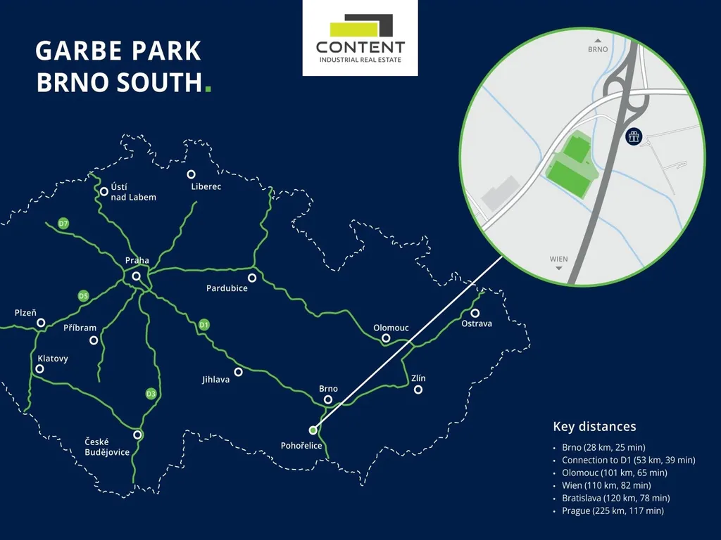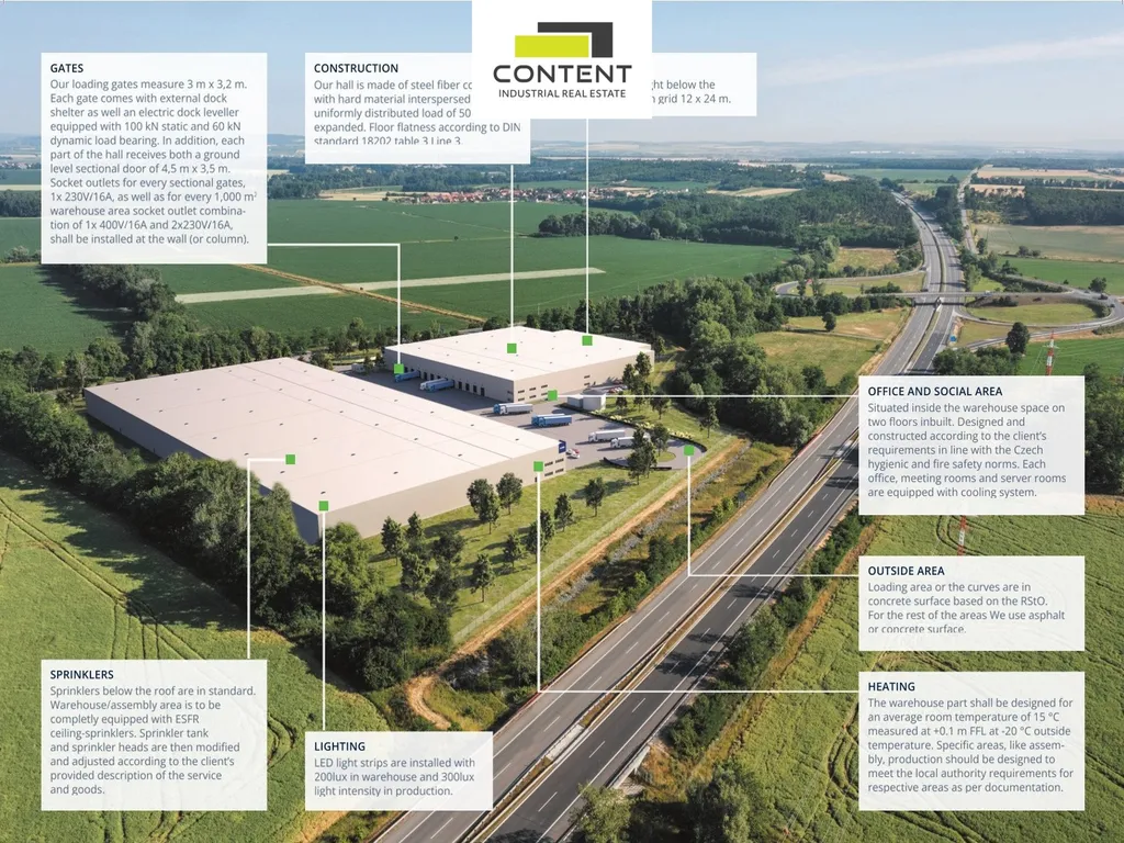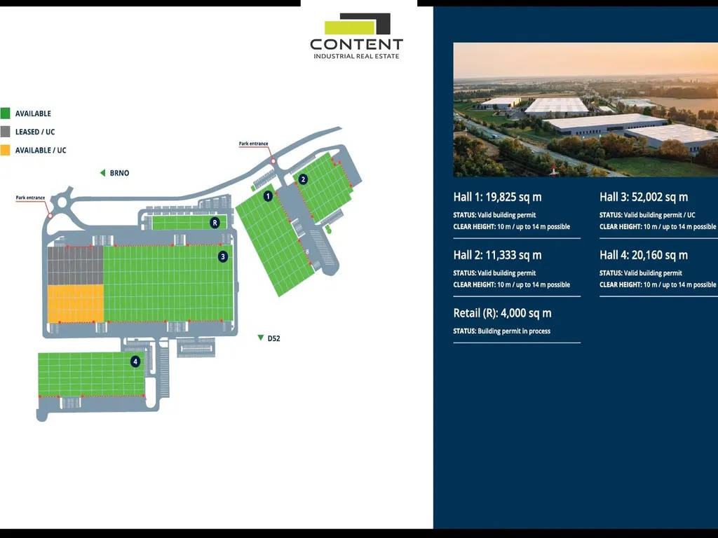 V zastoupení majitele a bez provize nabízíme samostatnou část novostavby skladu nebo výrobních prostor, umístěnou v moderním parku nacházejícím se podél dálnice D52, EXIT 23.