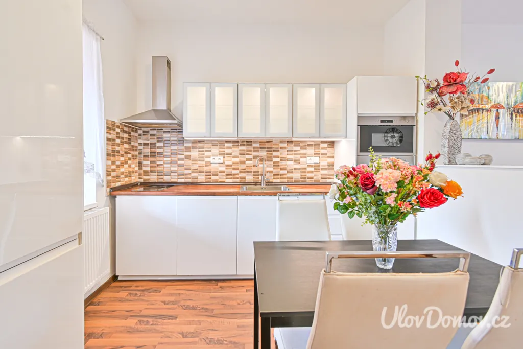 V kuchyni se nachází kuchyňská linka vybavena sklokeramickou deskou, troubou, mikrovlnou troubou, myčkou, lednicí a digestoří. Dále se zde nachází jídelní stůl se židlemi. Obývací pokoj je od kuchyně oddělen barovým pultem a dá se popřípadě přepažit a úplně oddělit od obývacího pokoje. Je zde tedy možnost byt předělat na 3+1. V koupelně je sprchový kout, umyvadlo se zrcadlem, Wc.
