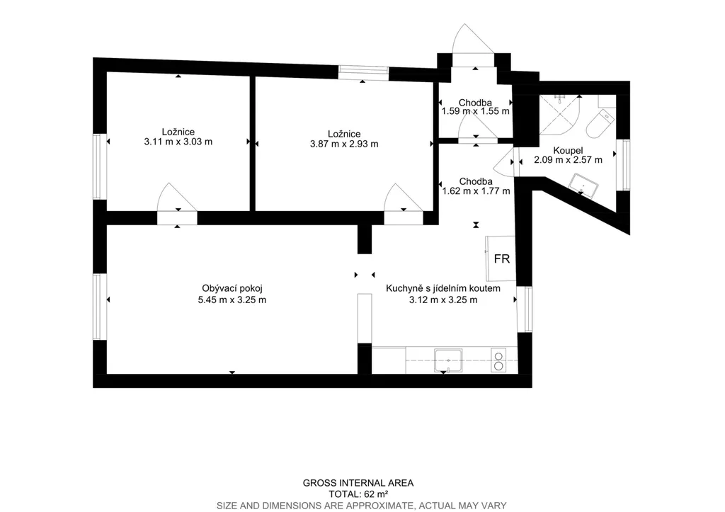 Dispozice zahrnuje vstupní předsíň, obývací pokoj s kuchyňským koutem, ložnicí, samostatný pokoj, koupelnu s toaletou.