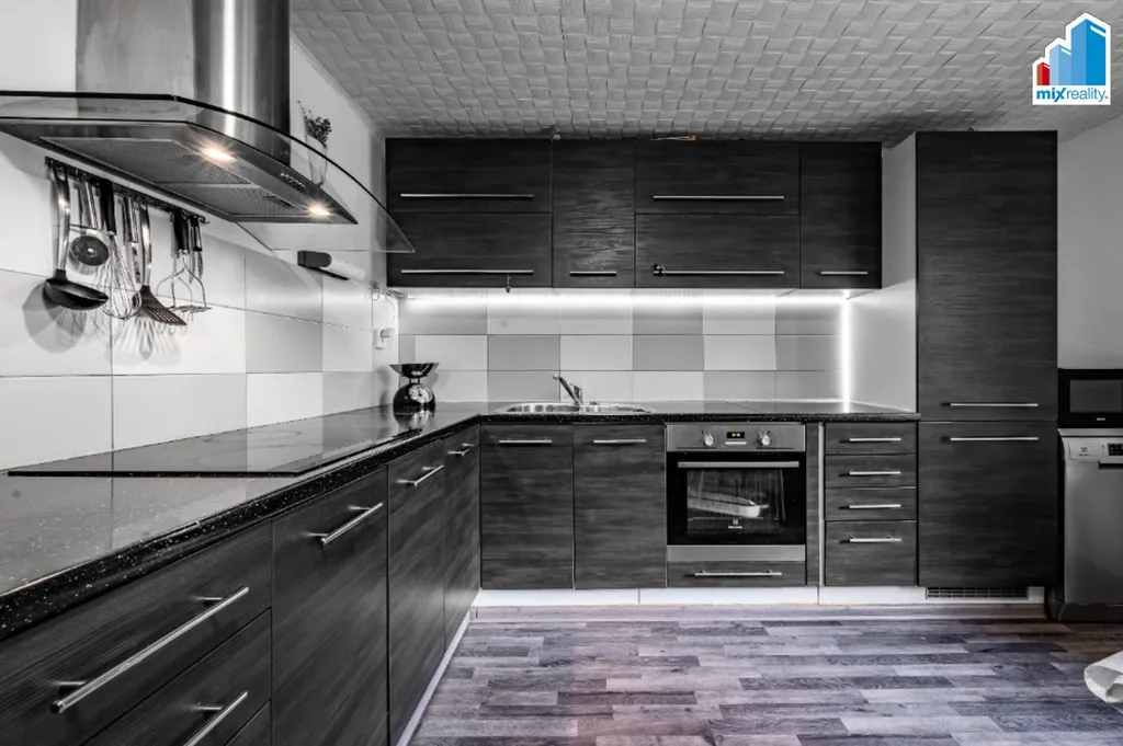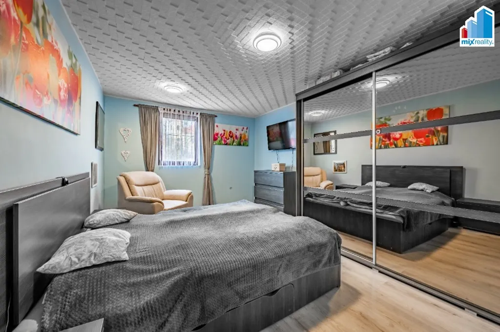Při vstupu z ulice se nachází garáž, prádelna a technické zázemí. Po schodišti vstoupíte do hlavní obytné části, kde je kuchyně s kuchyňskou linkou, obývací pokoj se vstupem na lodžii, ložnice a koupelna s vanou a WC.