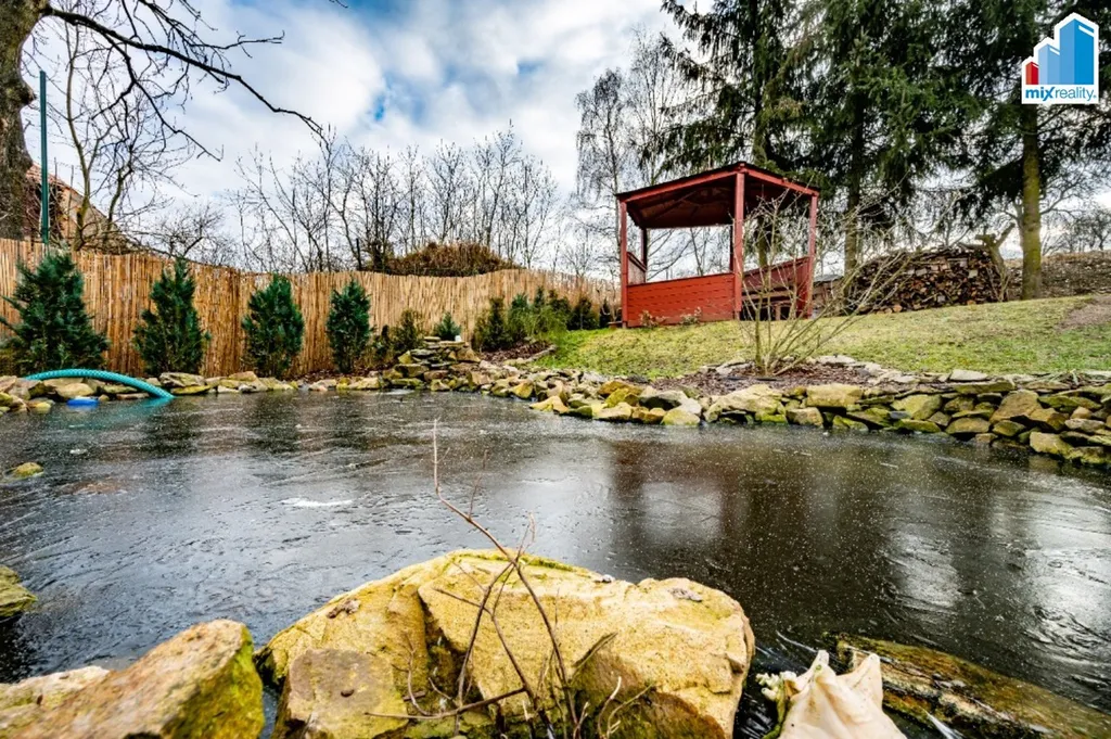 Na dům navazuje kryté posezení vhodné pro grilování. V zadní části zahrady se nachází altán, jezírko a připravený prostor pro budoucí bazén. Zahrada je osázena vzrostlými stromy, okrasnými keři a květinami a nabízí dostatek soukromí i prostoru pro relaxaci.