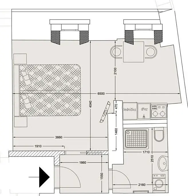 Dispozičně byt nabízí vstupní chodbu (2,98m2), prostorný pokoj (23,49m2) s kuchyňským koutem vybaveným vestavěnými spotřebiči (elektrická varná deska, mikrovlnná trouba, digestoř, lednice), a stylovou koupelnu (4,97m2) s umyvadlem, sprchovým koutem, toaletou a pračkou.
