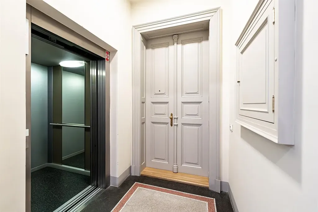 Reprezentativní zařízený byt 3+1 ( 2 ložnice, 2 koupelny), o velikosti 93 m2, je situovaný ve 2.NP rezidenční budovy s výtahem, která je kompletně zrekonstruovaná. Zachovaly se štukové stropy, dřevěná obložení a další prvky.
