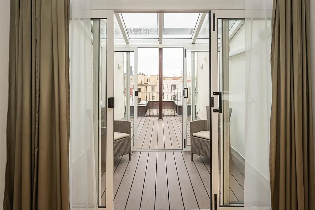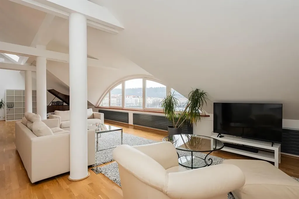 Luxusní prostorný mezonet s terasou a zimní zahradou, 5+kk (4 ložnice, 3 koupelny) o celkové rozloze 248 m2 je situovaný v 6. a 7. patře rezidenčního domu s výtahem. Byt nabízí obývací pokoj s plně vybavenou kuchyní (sporák/trouba, lednice, myčka) oddělenou skleněnou příčkou, 4 ložnice situované do klidné zóny vnitrobloku, 3 koupelny (sprcha, vana, bidet), 2x šatnu, komoru a prádelnu. Byt je vybaven nábytkem. Terasa a zimní zahrada jsou situované na jižní stranu. Nádherný výhled na Hradčany. SAT, telefonní linka a internet.