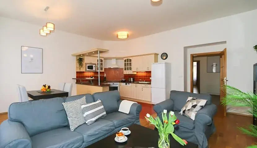 Poplatky: fixní ve výši 3.400,/měsíčně (wifi, úklid domu, výtah, osvětlení, odpady, pojištění) + vyučtovatelné zálohy na spotřebu energií ve výši 2.000, / osobu/měsíčně. Kauce je ve výši jednoho měsíčního nájmu. Možnost pronájmu parkování za poplatek: 2.000, + DPH 21%/měsíčně.