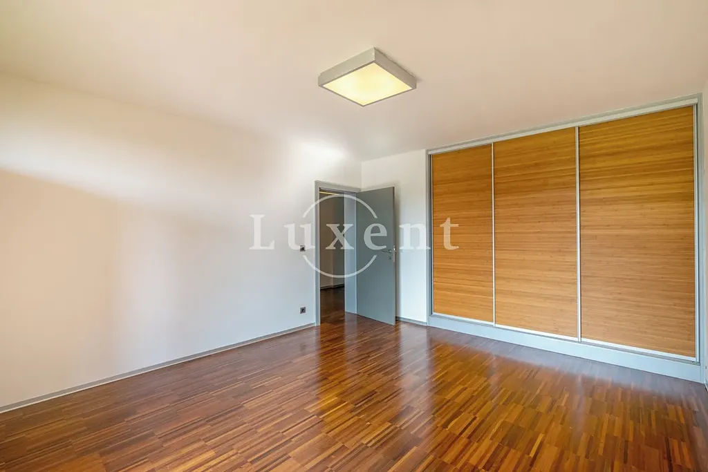 Většina plochy prvního podlaží je řešena jako otevřený a propojený obytný prostor, ve kterém na sebe plynule navazuje obývák s jídelnou a kuchyní (56 m²), lodžie (27 m²), zimní zahrada (17 m²) a atrium (26 m²). Společný obývací prostor je vybaven stylovými krbovými kamny a nábytkem zhotoveným na míru v souladu s charakterem domu. V zadní části je soukromá zóna. Z hlavní ložnice (17 m²) s knihovnou (5 m²) lze vejít prosklenými dveřmi do atria, dále je zde pracovna (6 m²), koupelna (10 m²), prostorná šatna (12 m²), technická místnost a separátní toaleta (3 m²). Litinové kruhové schodiště umístěné v obývací místnosti propojuje toto podlaží se spodním, kde jsou dvě ložnice (15 a 21 m²), koupelna (5 m²) a technická místnost.. Z obou ložnic se vchází prosklenými dveřmi na zahradu. V její dolní části je vjezd do samostatně stojící garáže (42,3 m²) s místem pro dva vozy, s WC s umyvadlem a technické zázemí, které lze využívat jako sklep.