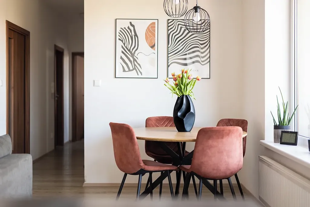 Obývací část bytu vás ohromí svojí atmosférou a světlem. Napříč celým pokojem se táhne velkoformátové okno s výstupem na terasu a panoramatickým výhledem přímo na kostel ve Starém Lískovci a do zeleně okolo. Celý prostor je logicky rozdělen na pracovní, jídelní a odpočinkovou část.