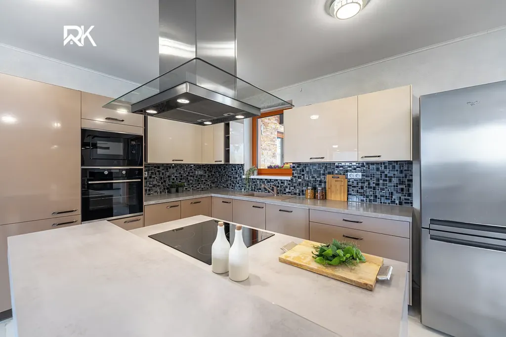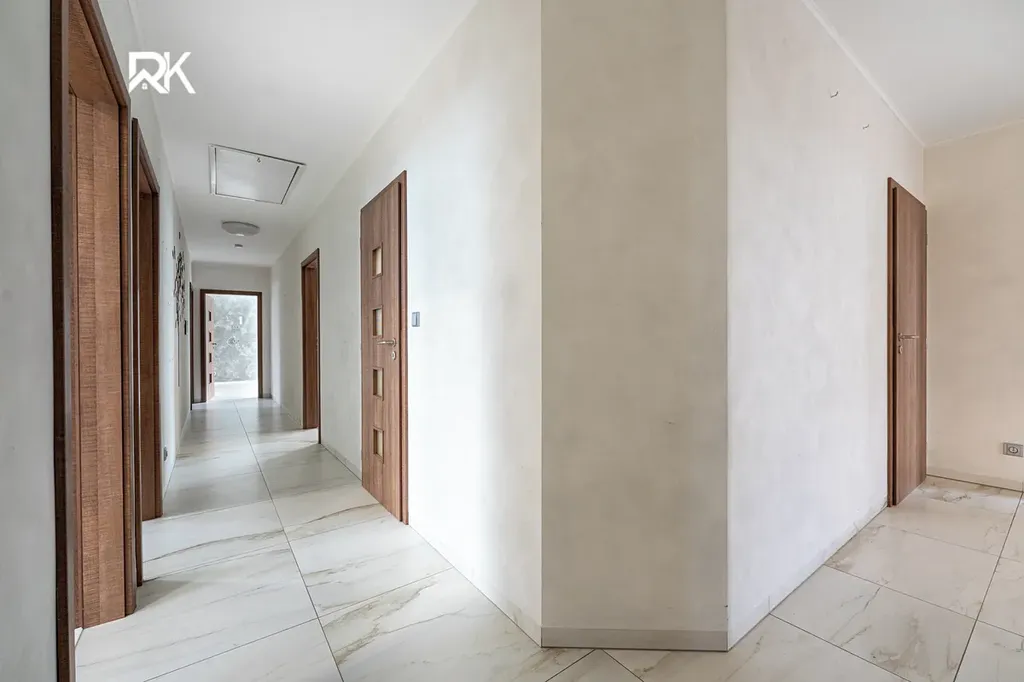 Dům je dispozičně řešen jako velkorysé 5+kk. Dominantou je prostorný obývací pokoj propojený s kuchyní a jídelnou, jehož atmosféru doplňují krbová kamna. Z obytného prostoru je přímý vstup do zimní zahrady, která je vytápěná i klimatizovaná a umožňuje plnohodnotné využití po celý rok. Soukromou část domu tvoří čtyři samostatné ložnice, přičemž každá disponuje vlastní šatnou. K dispozici jsou dvě koupelny, tři samostatné toalety, praktická spíž u kuchyně a další samostatná šatna u vstupu do domu. Další úložný prostor nabízí skladovací místnost v podkroví o velikosti cca 35 m².