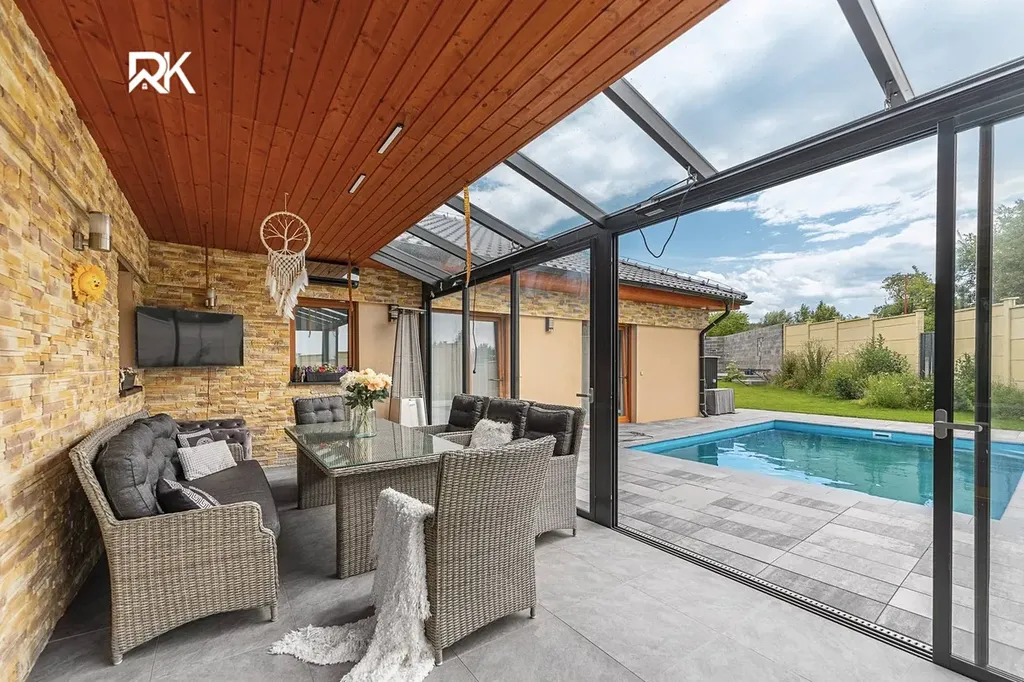 Exteriér domu je navržen s důrazem na pohodlí i reprezentativní využití. K dispozici je kryté parkování pro tři vozy, elektrická vjezdová brána a 400V zásuvka vhodná například pro wallbox či dílenské využití. Na zahradě se nachází nadstandardní bazén s protiproudem, vyhřívaný samostatným tepelným čerpadlem. Zahrada je kompletně zatravněná, vybavena automatickou závlahou a retenční nádrží na dešťovou vodu. Připravena je také infrastruktura pro venkovní kuchyni včetně přívodu vody, odpadu a WC. Součástí jsou dvě zahradní kůlny pro technické zázemí.