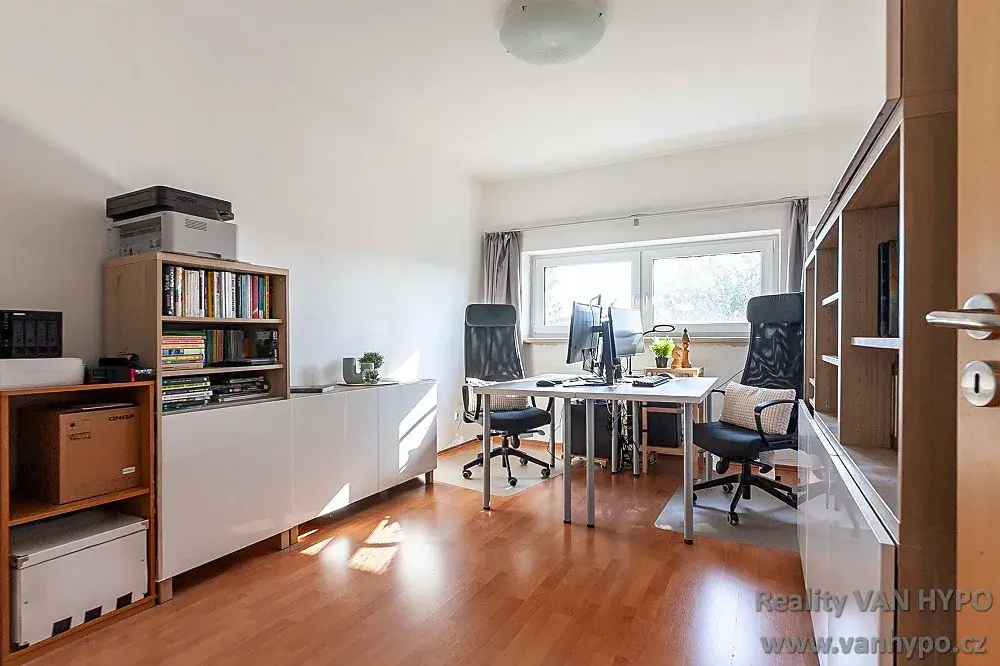 Jednotka 5+kk má velice praktickou dispozici a novému majiteli nabízí zádveří, dále halu, ze které se vstupuje do prostorného obývacího pokoje s jídelní částí a plně vybaveným kuchyňským koutem se samostatnou spíží, z obývacího prostoru je pak možné vstoupit na příjemnou, zastřešenou terasu a dále do zahrady, součástí přízemí je i pokoj a samostatná toaleta. Ve 2. NP jsou pak 3 ložnice (jedna s balkónem 5 m2), koupelna se sprchovým koutem, vanou a toaletou, a dále technická místnost s místem pro pračku a sušičku. Půda je pochozí a upravena jako skladový prostor.