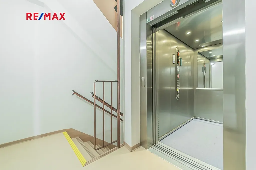 Byt se nachází v 5. patře s výtahem. K bytu náleží sklep a dále je v domě k dispozici kočárkárna a kolárna.