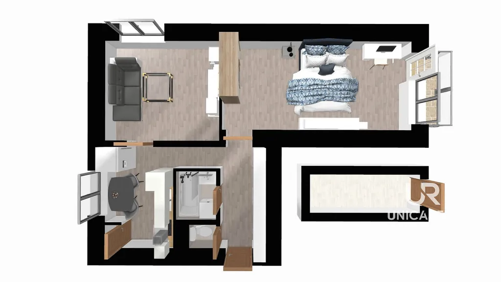 Kuchyně – severozápad. Obývací pokoj – severovýchod. Ložnice s balkonem – jihovýchod, výhled do klidného sídliště.