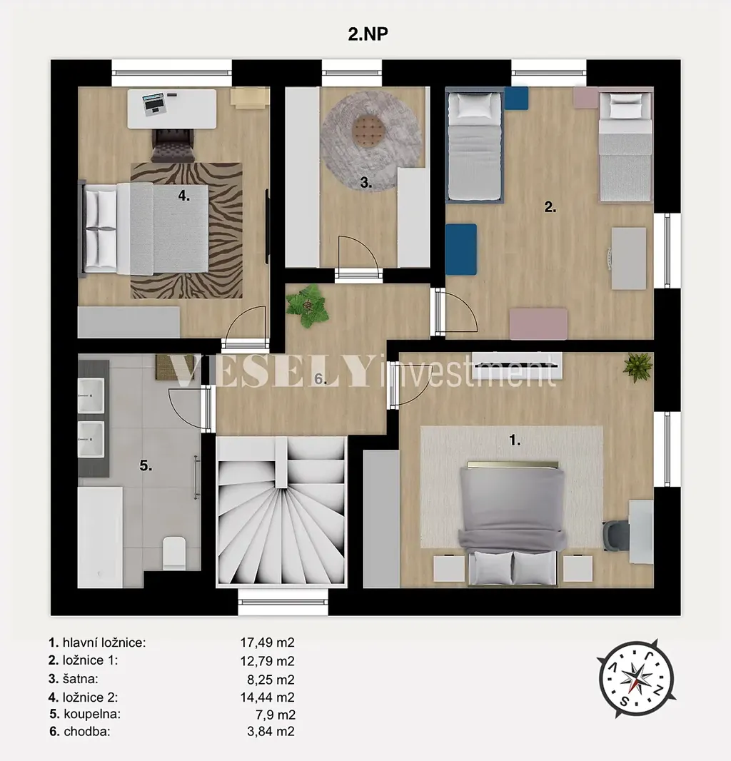 Tvoří chodba (3,84 m2) ze vstupy do 3 samostatných ložnic (hlavní ložnice – 17,49 m2, ložnice 1 – 12,79 m2, ložnice 2 – 14,44 m2), dále pak do šatny (8,25 m2) a velké koupelny se záchodem (7,9 m2).