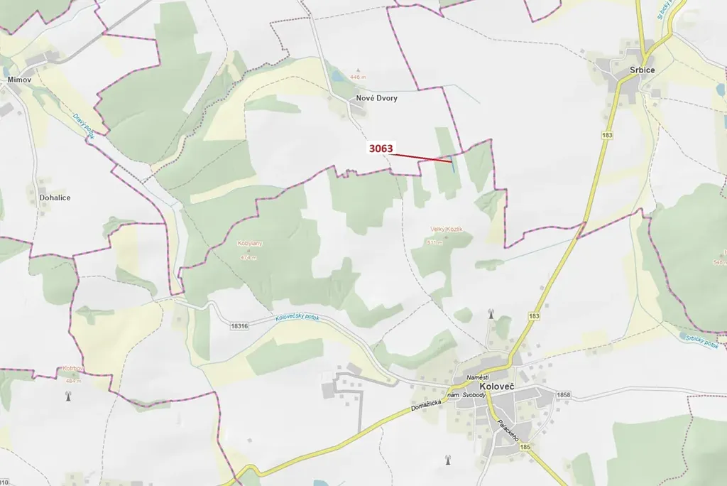 Lesní pozemek o výměře 703 m2, parcelní číslo 3063, podíl 1/1, katastrální území Koloveč, obec Koloveč, obec s rozšířenou působností Domažlice, okres Domažlice, Plzeňský kraj. Po těžbě.