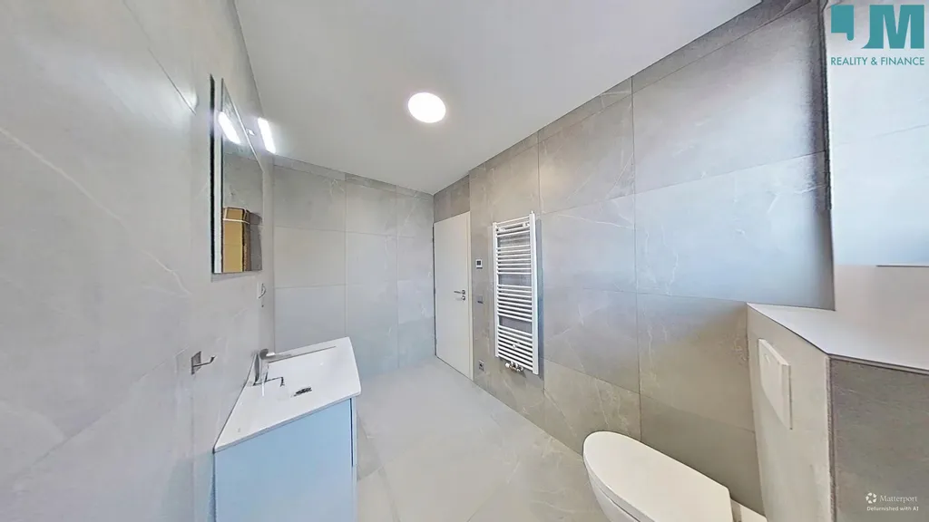 Koupelna je provedena v nadčasovém designu s velkoformátovými obklady, nabízí dostatek prostoru, moderní umyvadlovou skříňku, WC a praktický topný žebřík.