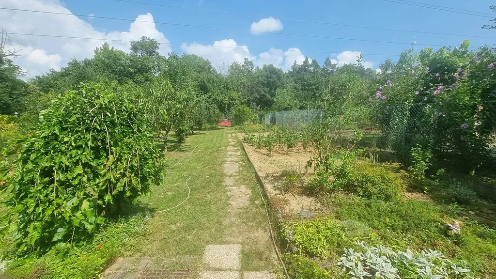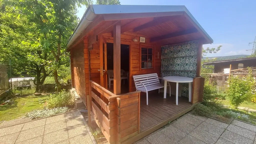 Součástí pozemku je i dřevěný zahradní domek s verandou (12 m²), kam je přivedena elektřina.