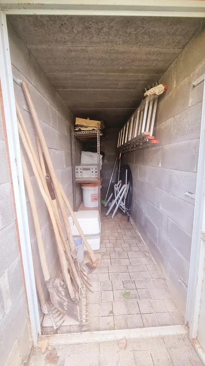 Zděný sklep je vybavený úložnými regály, zahradnickým náčiním a chemickou toaletou.