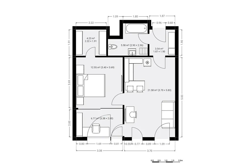 - Obývací pokoj s kuchyňským koutem: 21,58 m²