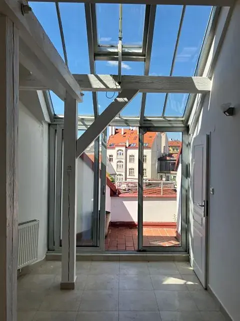 Nabízíme na pronájem zajimávý by t2+kk s galerií a terasou v samém centru Prahy nacházející se ve 4.patře bez výtahu.Tento byt, který je na patře jediný poskytuje soukromí a krásný výhled z terasy na Prahu.Dispozice: vstup, velký obývací pokoj s kuchynským koutem a výstupem na terasu, koupelna s Wc(sprch.kout),ložnice, galerie..k bytu náleží komora na patře.