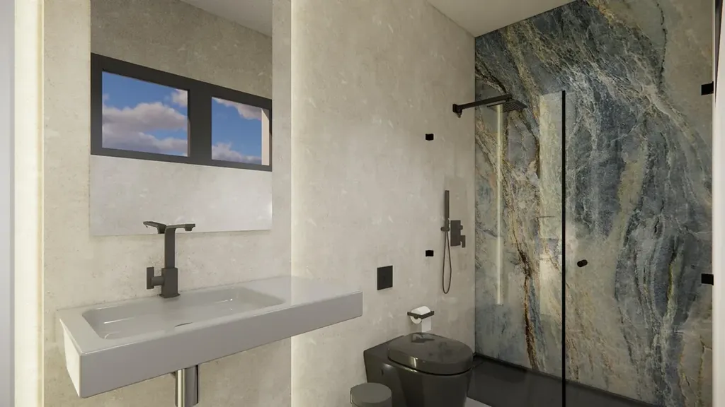 V horním patře jsou dvě prostorné ložnice, každá s vlastní koupelnou, z nichž jedna je en suite. Oba pokoje mají vstup na soukromou otevřenou terasu o rozloze 17 m². Pro ty, kteří chtějí ještě více venkovního prostoru, je možné za příplatek vybudovat střešní solárium.