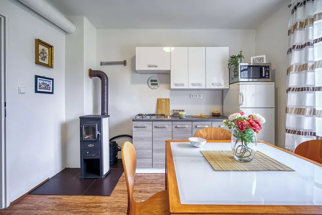 Vytápění je zajištěno krbovými kamny a elektrickými přímotopy, které udržují pohodlnou teplotu po celý rok.