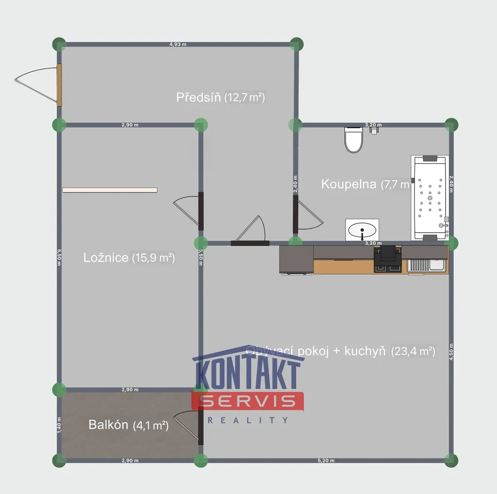 Užitná plocha: 64 m². Prostorná předsíň, obývací pokoj o velikosti 23 m² se vstupem na lodžii, plynule navazuje na moderní plně vybavenou kuchyň.