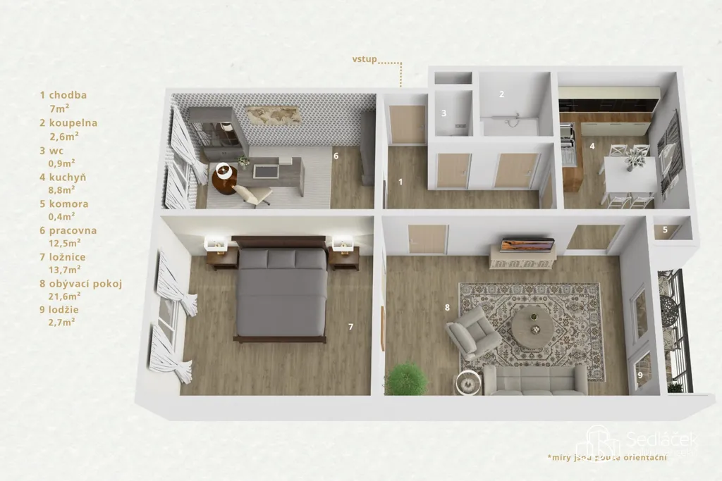 Byt nabízí prakticky řešenou dispozici se třemi samostatnými pokoji – obývacím pokojem se vstupem na balkon, ložnicí a dětským pokojem. Samostatná kuchyně poskytuje dostatek prostoru pro jídelní kout a navazuje na ni praktická komora, ideální pro uskladnění potravin či dalších věcí.
