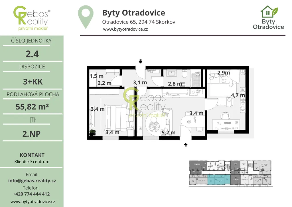 Ve výhradním zastoupení si Vás dovolujeme oslovit nabídkou moderní bytové jednotky o dispozici 3+KK a celkové užitné ploše 55,8m², která se nachází v kompletně zrekonstruovaném bytovém domě v obci Otradovice – Skorkov pouhých 5 minut od Brandýsa nad Labem – Staré Boleslavi. Projekt Byty Otradovice zahrnuje celkem 16 bytových jednotek různých velikostí a nabízí kvalitní a komfortní bydlení v klidné lokalitě s výbornou dostupností do Prahy, Brandýsa nad Labem – Staré Boleslavi i Mladé Boleslavi. Součástí kupní ceny je parkovací stání před domem, kuchyňská linka vyrobená na míru od truhláře včetně vestavných spotřebičů, kompletní sanita v koupelně značky JIKA a zděný sklep o minimální ploše 15 m² umístěný v suterénu domu.