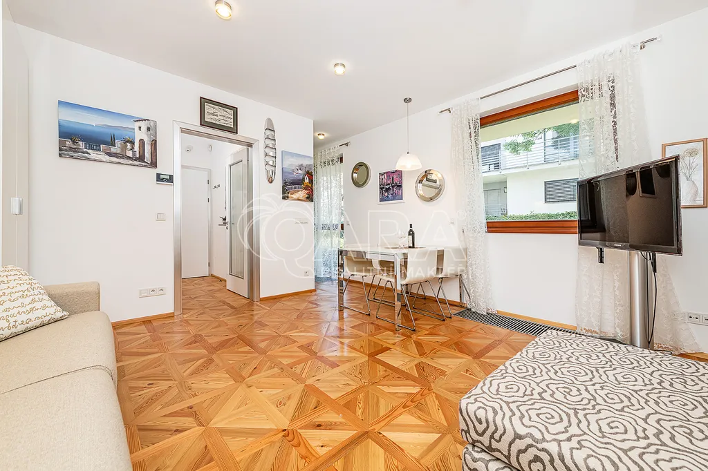 Dispozičně skvěle řešený byt tvoří prostorný obývací pokoj s plně vybaveným kuchyňským koutem, koupelna se sprchovým koutem, samostatnou toaletou a vstupní chodba s množstvím úložných prostor. Z loken všech se otevírá uklidňující výhled do okolní zeleně, kde je naprostý klid a harmonie.