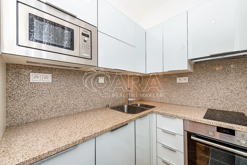 Interiér bytu je v nadstandardním provedení – dřevěné podlahy, podlahové vytápění v koupelně, bezpečnostní vstupní dveře s videotelefonem, interiérové dřevěné dveře značky Sapeli, vestavěné skříně a praktické úložné prostory. Kuchyňská linka je vybavena veškerými spotřebiči. Nábytek na fotkách je součásti ceny bytu.