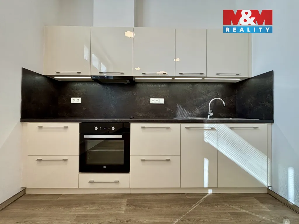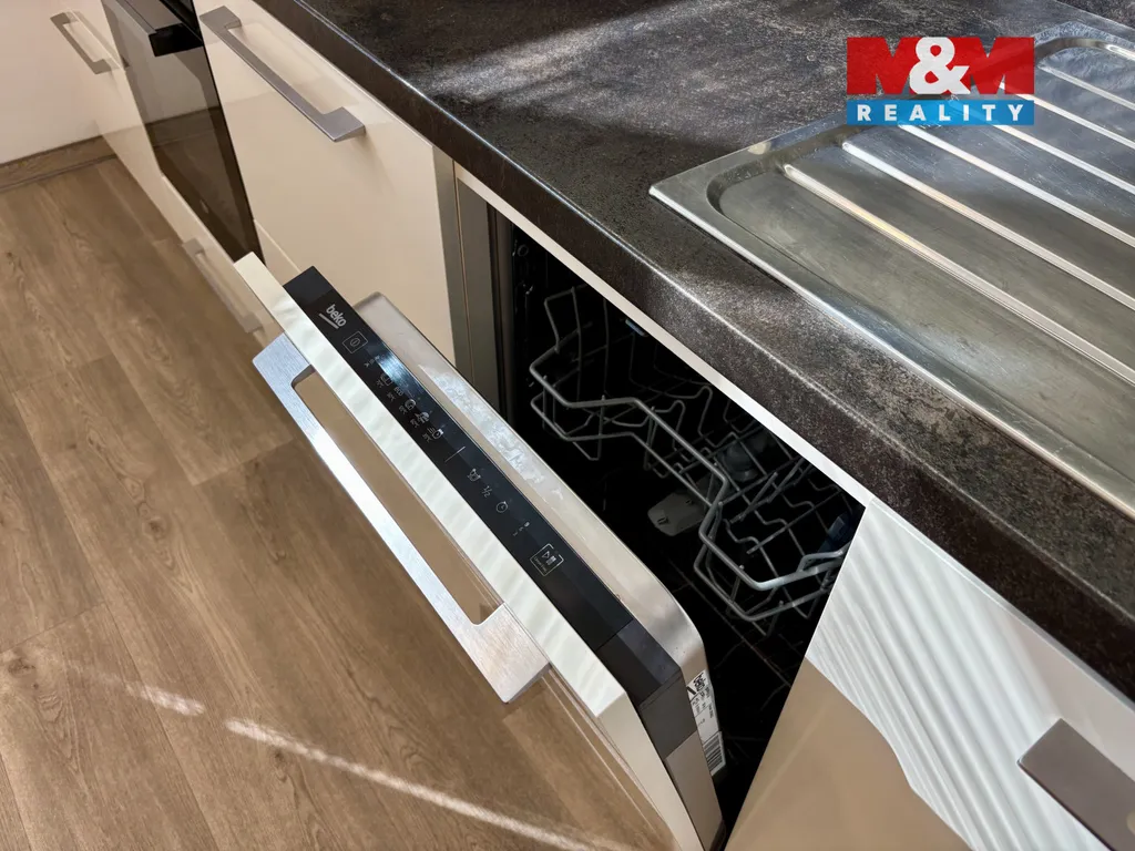Byt voní novotou a je vybaven zcela novou kuchyňskou linkou s vestavěnými spotřebiči–myčka, trouba a indukční varná deska.