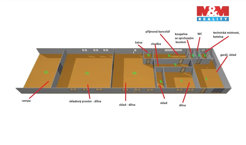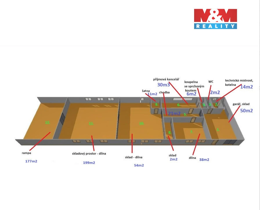 Hledáte k dlouhodobému pronájmu víceúčelový komerční prostor o užitné ploše 427 m², vhodný pro výrobu, obchod, služby, administrativu i skladování. Prostor se nachází v obci Markvartice v okrese Český Krumlov, pouhých 3,5 km od města Velešín, několik minut jízdy od nájezdu na dálnici D3. Pronajímaný prostor je součástí větší budovy o celkové zastavěné ploše 1 103 m². K dispozici jsou garážové stání, dílna, skladové prostory (s možností využití jako další dílna), šatna, kancelář, koupelna se sprchovým koutem a toaletou, samostatné WC, technická místnost a nakládací rampa. Parkování je možné pohodlně přímo u budovy. V roce 2024 proběhlo zateplení objektu, realizace nové fasády, instalace nových garážových vrat a kamerového bezpečnostního systému. Vytápění je zajištěno kotlem na tuhá paliva, přičemž palivo i obsluhu zajišťuje nájemce. Měsíční nájemné činí 30000 Kč, jistota a provize ve stejné výši. Cena za vodu a elektřinu bude stanovena individuálně dle charakteru provozu.