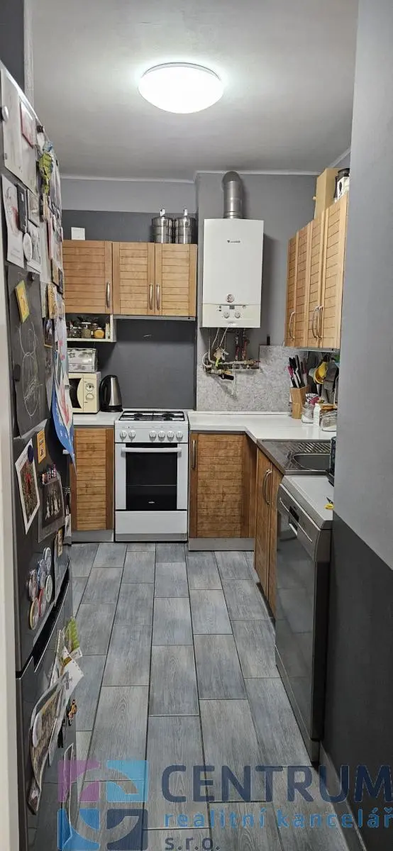 chodba s vestavěnou skříní; kuchyň - kuchyňská linka vč. kombinovaného sporáku vč. digestoře, myčka nádobí; obývací pokoj se vstupem na lodžii; ložnice vč. vybavení - manželská postel bez matrací, 2x vestavěná skříň; dětský pokoj; zděná koupelna s vanou a místem na pračku i sušičku; samostatná toaleta; v bytě jsou plovoucí podlahy a dlažba ( chodba, koupelna a toaleta ), plastová okna.