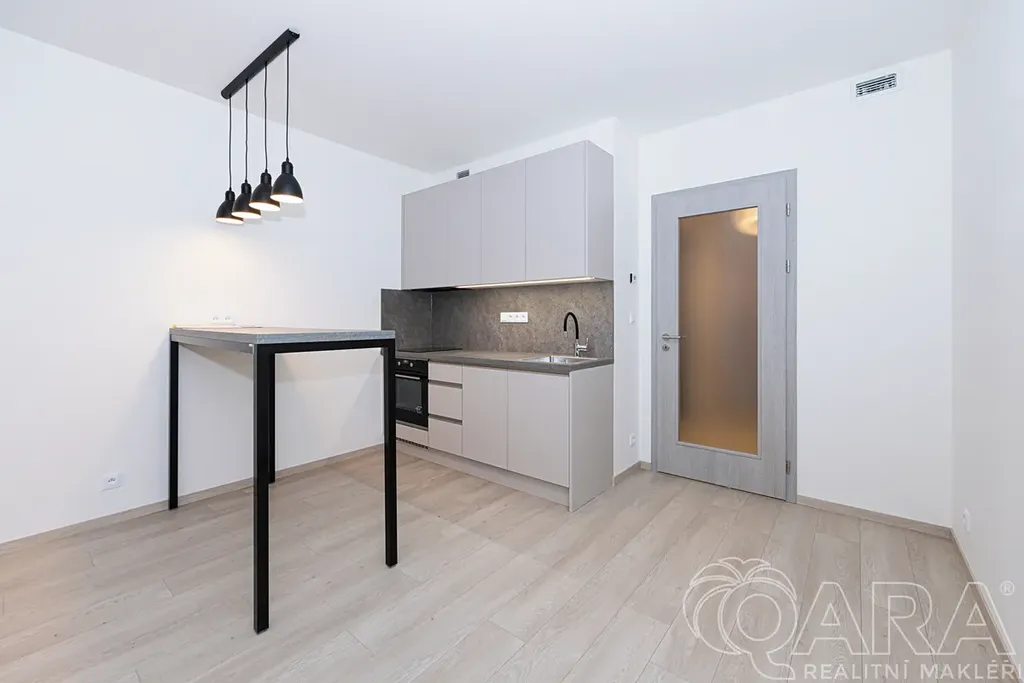 Byt je dispozičně řešen vstupní chodbou s vestavěnou šatní skříní, koupelnou s toaletou, sprchovým koutem, a dále obytnou místností s kuchyňskou linkou a vstupem na lodžii. Byt je orientován mimo rušnou silnici a tramvajovou trať, což zajišťuje klidné bydlení i příjemný výhled do vnitrobloku. Součástí vybavení je kuchyňská linka s jídelním stolem, velká vestavěná skříň, robotický vysavač a modem pro připojení k internetu. K bytu náleží také sklepní kóje v suterénu domu. Byt se vyznačuje velmi nízkými provozními náklady, energetická náročnost budovy je třídy B a je vybaven rekuperační jednotkou. Zúčtovatelné zálohy činí 2.500,-Kč měsíčně, plus elektřina a do budoucna fond oprav.