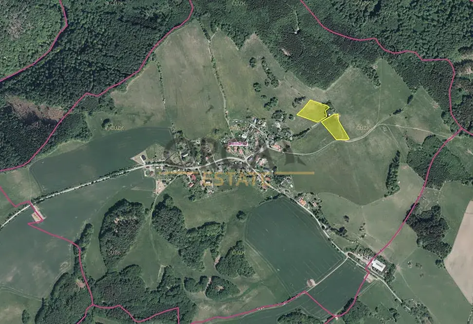 Nabízíme k prodeji spoluvlastnický podíl ve výši id. 1/2 na pozemcích v k.ú. Sendraž, okres Náchod. Jedná se o parcely č. 293/1 a 290/1 o celkové podílové výměře 6.457 m2 zapsané na LV 184. Parcela č. 293/1 měří na šířku cca 82 m a parcela 290/1 měří v nejširší části cca 75 m. Pozemky se nacházejí v těsné blízkosti na severovýchodě obce, jsou svažité a přístupné z polní cesty. Dle katastru jsou pozemky evidovány jako trvalý travní porost, v územním plánu leží v plochách zemědělských. Na pozemcích je uzavřena pachtovní smlouva na dobu neurčitou s výpovědní lhůtou 1 rok.