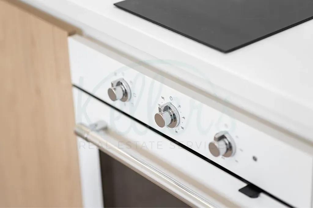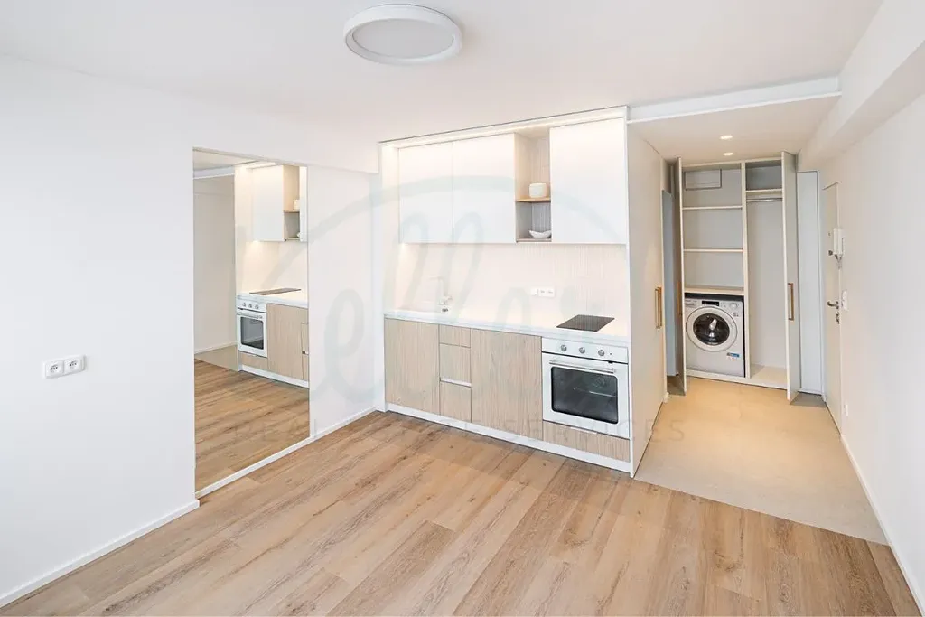 Obytná místnost je díky oknům po celé šířce a západní orientaci velmi prosvětlená. Kuchyňská linka na míru s LED podsvícením je osazena vestavěnými spotřebiči – lednicí s mrazákem, dvouplotýnkovou indukční deskou Electrolux a bílou moderní troubou. Na obytnou zónu volně navazuje dlážděné zádveří, kde naleznete dvě vestavěné skříně. Mysleli jsme opravdu na vše, a proto je v jedné z těchto skříní šikovně ukrytá pračka kombinovaná se sušičkou. Všechno toto vybavení je již samozřejmě v ceně bytu.