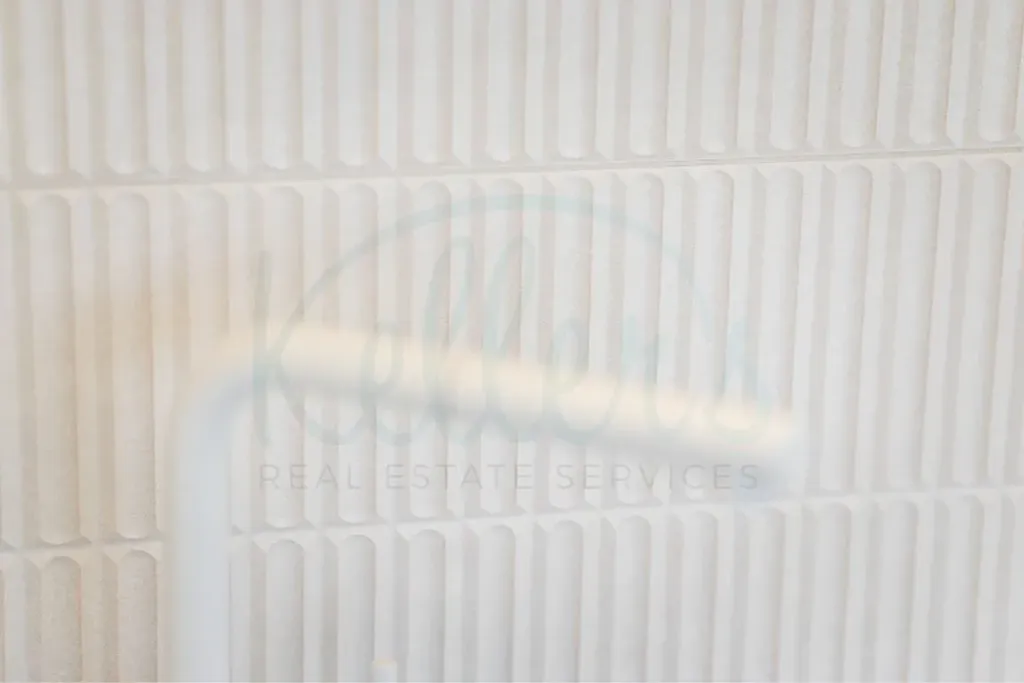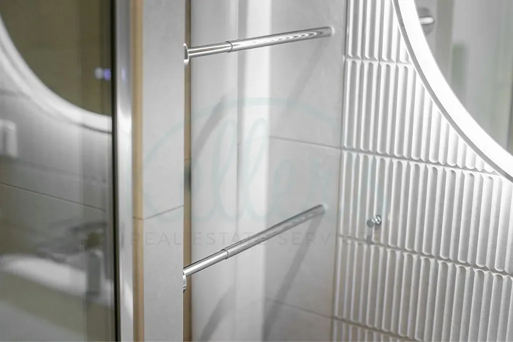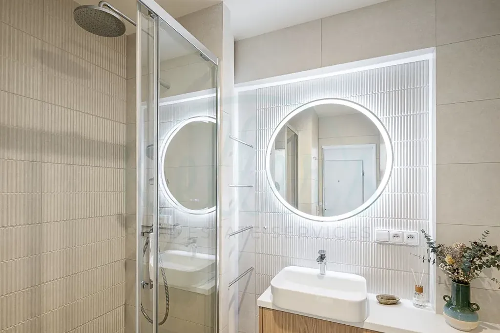 V neposlední řadě bylo pomocí nových zděných příček úplně změněno dispoziční řešení koupelny. Ta se stala díky povedenému designu skutečnou chloubou tohoto bytu. Podsvícené zrcadlo s nastavitelnou barvou světla a vyhříváním proti orosení dává krásně vyniknout obkladu s 3D reliéfem, nástěnná vestavěná skříňka nad toaletou nenápadně splývá s okolním obkladem a nerezové konzole instalované u centrálního vedení koupelnového vytápění podtrhují stylovou praktičnost celé koupelny. Samozřejmostí je kvalitní sanita – závěsné WC značky Grohe, sprchový systém a umyvadlová baterie značky Hansgrohe.