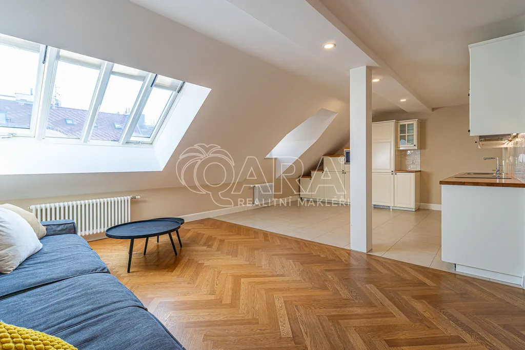 K pronájmu nadstandardní, kompletně zrenovovaný mezonetový byt situovaný v nejvyšších patrech zrekonstruovaného historického domu. Budova se nachází na jedné z nejprestižnějších adres Prahy – na Starém Městě.