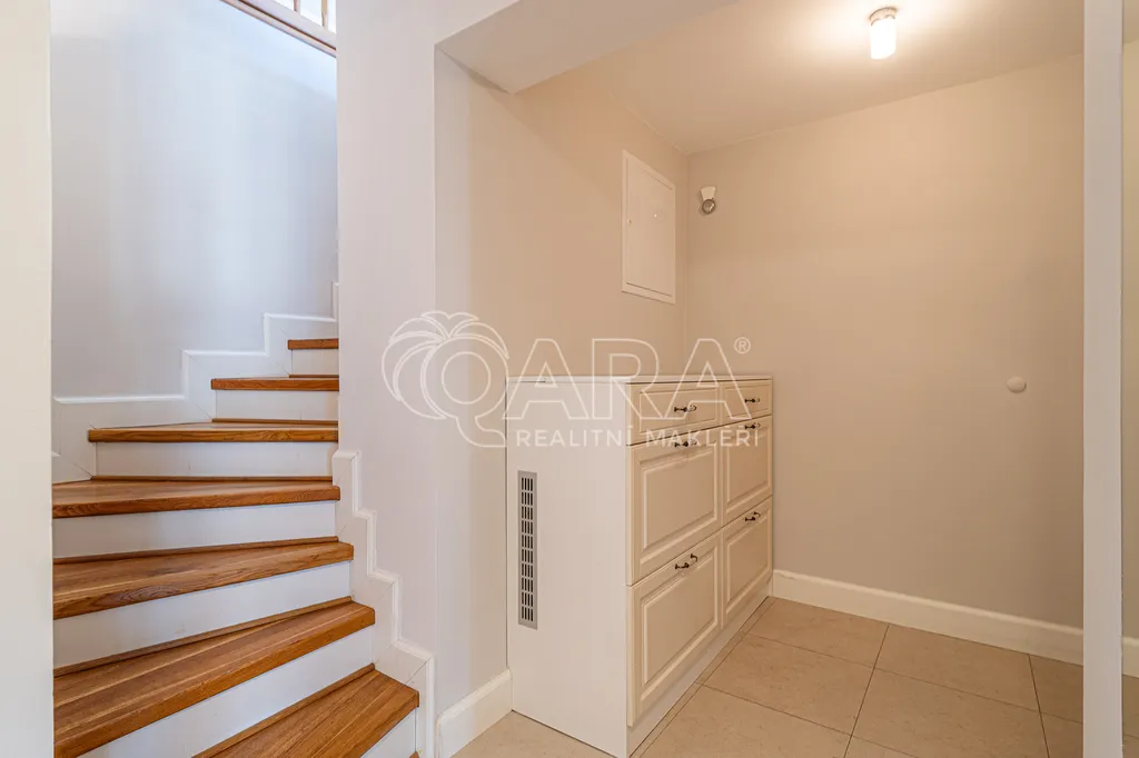 Spodní patro tvoří klimatizovaný velkorysý obývací pokoj s plně vybavenou kuchyní a praktickou spíží, ložnice s vestavěnými skříněmi, koupelna se sprchovým koutem a toaletou.