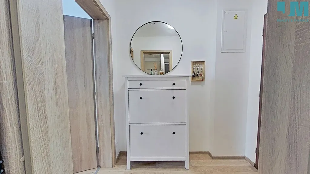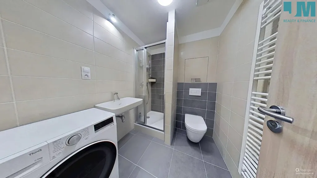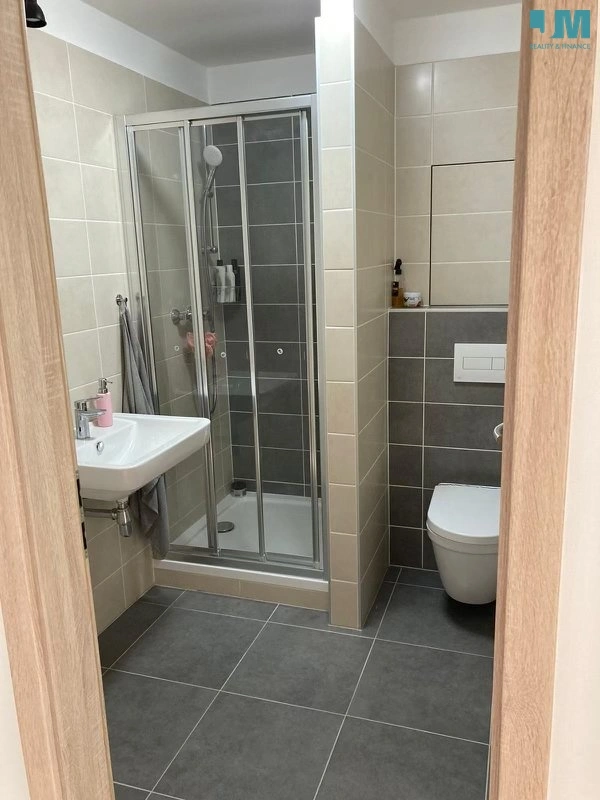 Koupelna je řešena v moderním stylu a nabízí sprchový kout, umyvadlo a toaletu. Součástí bytu je také předsíň s úložným prostorem. Interiér působí čistě, svěže a velmi útulně.
