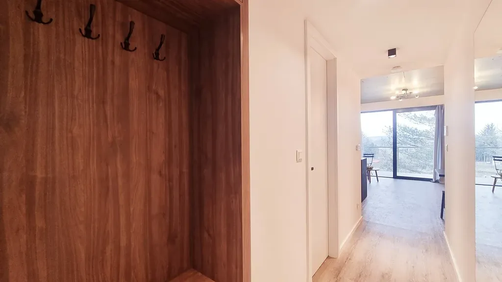 V chodbě (8 m²) je vestavěná šatní skříň, věšáková stěna, botník, zrcadlo a Intercom.