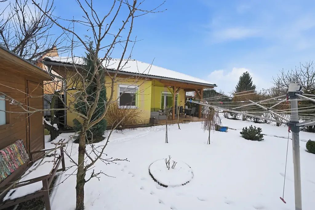 Exteriér domu nabízí kultivovanou zahradu se vzrostlými dřevinami, která poskytuje dostatek soukromí i příjemné klima v letních měsících. Součástí je nadzemní kruhový bazén, zastřešená terasa s posezením a další pergola u garáže. Praktické zázemí doplňuje samostatná garáž a kůlna pro uložení nářadí či zahradní techniky. Celkově působí zahrada upraveným a harmonickým dojmem a nabízí prostor jak pro relaxaci, tak pro rodinné aktivity.