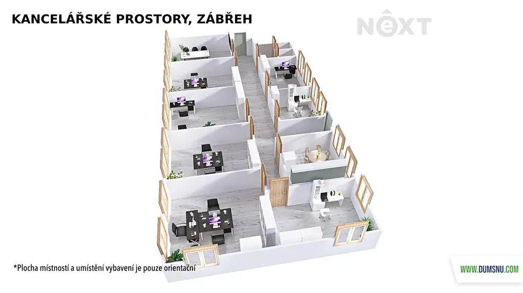 Rekonstrukce těchto prostor je v plném proudu a aktuálně je k dispozici kancelář č. 3 (17,8 m2). Její umístění vidíte na vizualizaci interiéru.