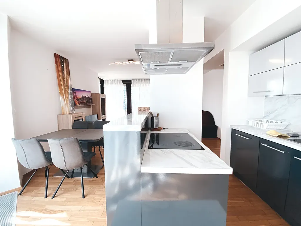 Dominantou bytu je prostorný obývací pokoj (téměř 33 m²) s plně vybavenou kuchyňskou linkou a přímým vstupem na velkou rohovou terasu o výměře 21,82 m², která nabízí dostatek prostoru pro venkovní posezení i relax. Díky vyššímu patru je byt velmi světlý a vzdušný.