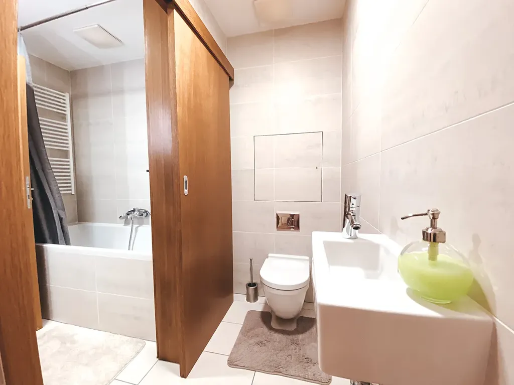 Ložnice je samostatná, klidová, s dostatkem místa pro velkou postel i úložné prostory. Výhodou je také samostatné WC a oddělená koupelna s vanou. Součástí bytu je technická místnost (pračka, úložný prostor).