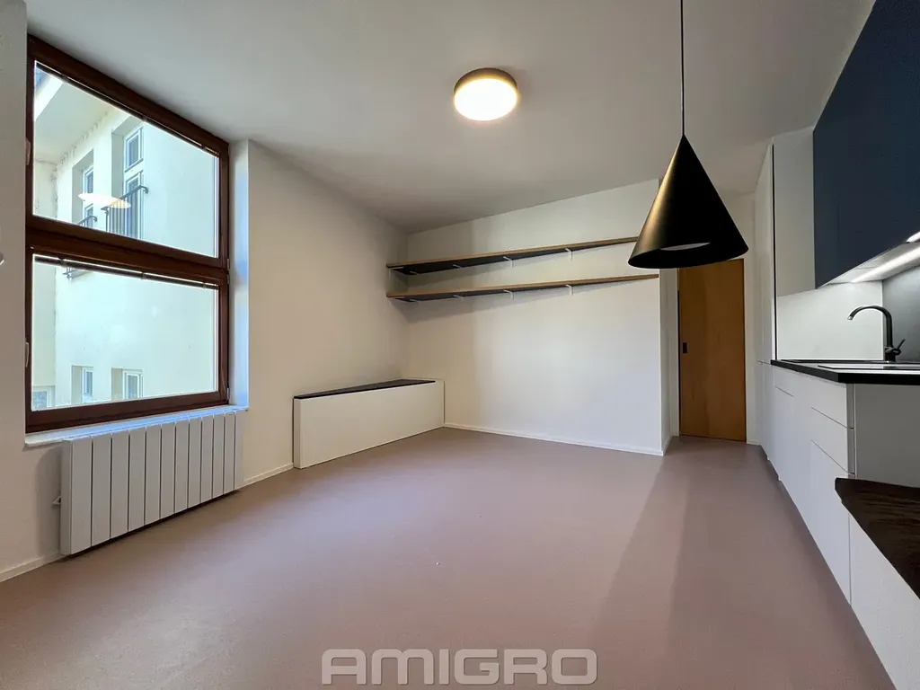 Nabízíme pronájem krásného nadstandardního ateliéru 1+kk s výměrou 26 m2, který se nachází ve 4. nadzemním podlaží cihlového domu s výtahem v centru Brna, ul. Peroutková (nad Zelným trhem).