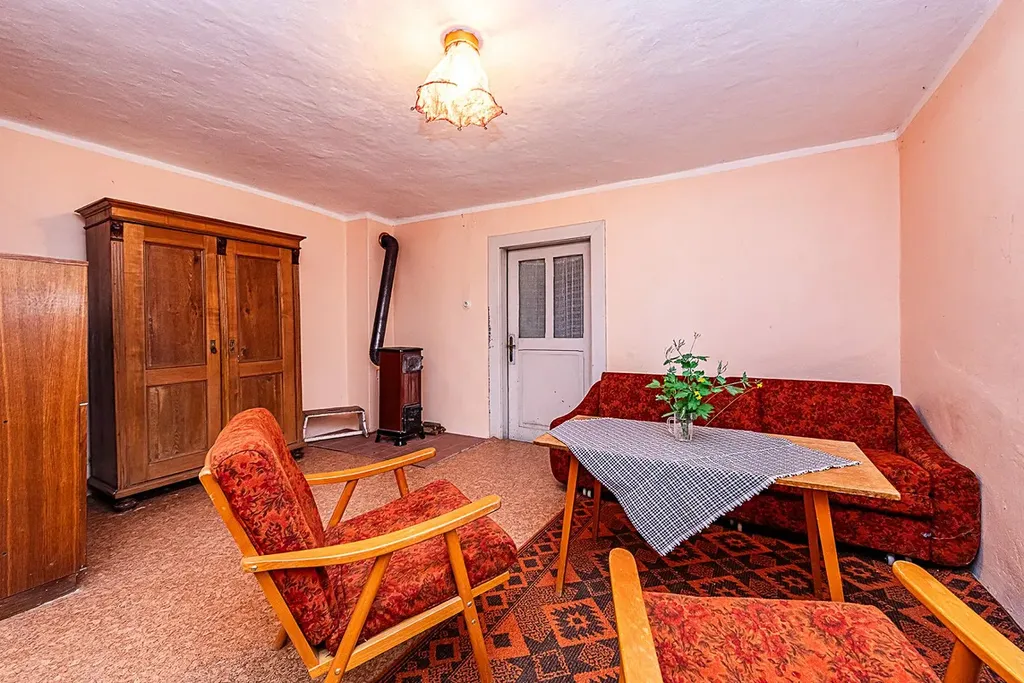 Dispozice domu zahrnuje kuchyni s jídelním koutem, prostornou ložnici, obývací pokoj, další pokoj a koupelnu s vanou. Vytápění zajišťují krbová kamna umístěná v jednotlivých místnostech. Dřevěná okna i dveře jsou původní. Půdní prostory jsou aktuálně využívány jako úložné, do budoucna však nabízejí možnost vybudování dalších pokojů dle vašich potřeb.