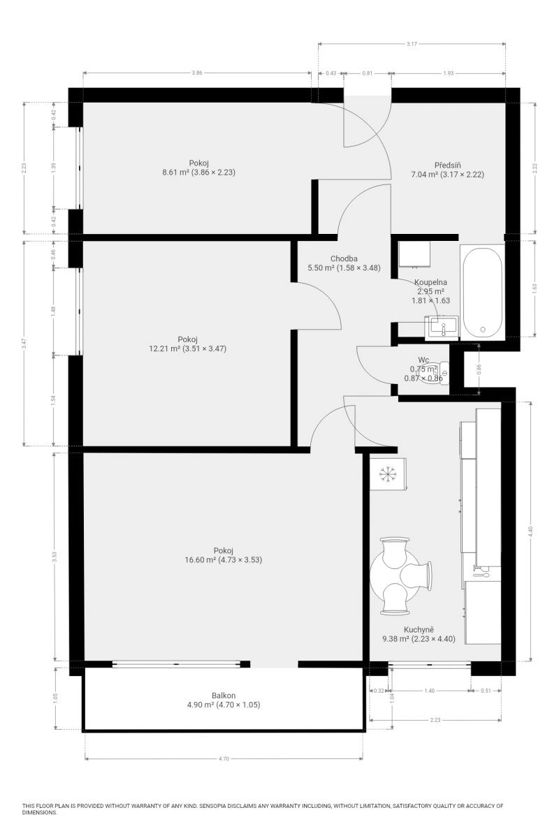 Byt se nabízí vybavený dle fotografií. Kuchyně je vybavena kuchyňskou linkou se spotřebiči – k dispozici je elektrická trouba, varná deska, digestoř, lednice, myčka a pračka. Dispozice bytu nabízí tři samostatné pokoje, které lze využít jako ložnici, obývací pokoj či dětský pokoj nebo pracovnu. Díky tomu je byt vhodný jak pro rodinu, tak i pro spolubydlení. Koupelna je vybavena vanou a umyvadlem, toaleta je umístěna samostatně. V bytě se nachází také prostorná vstupní chodba, která nabízí dostatek místa pro úložné prostory.