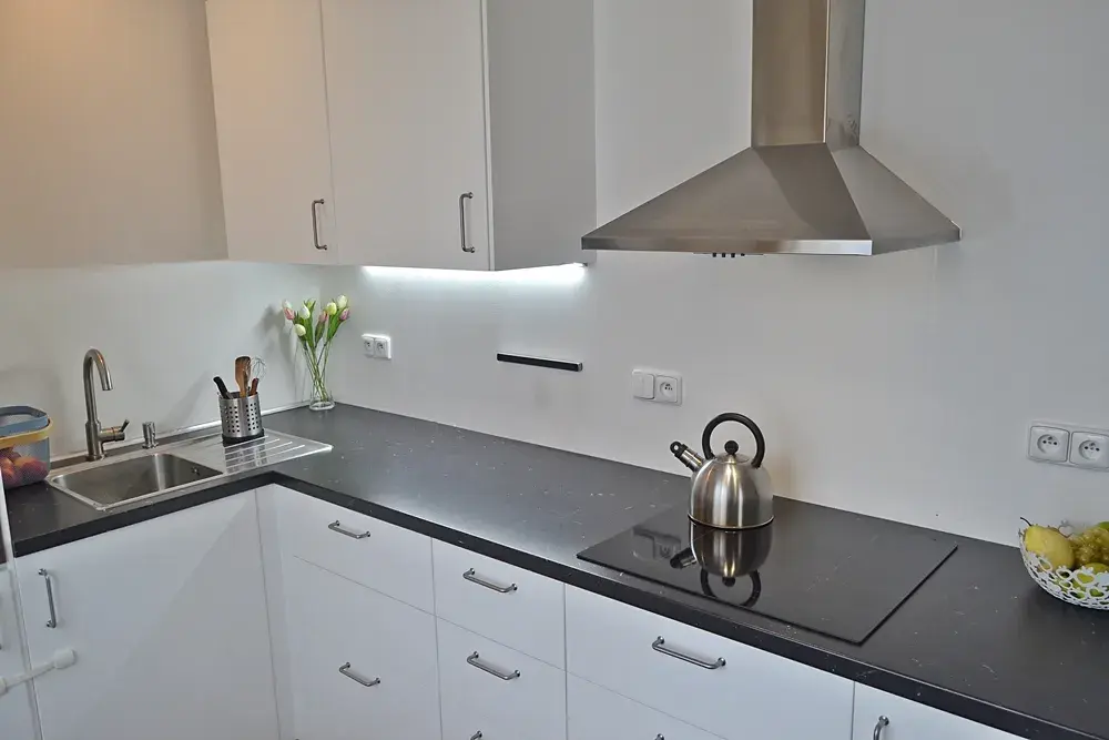 Koupelna se sprchovým koutem a pračkou, samostatné WC. Ve vstupní chodbě je prostorná vestavná skříň. Kuchyň je vybavena linkou se spotřebiči (lednice s mrazákem, mikrovlnná trouba, sporák), jídelním stolem a židlemi. Obývací pokoj disponuje pohovkou, psacím stolem, skříňkou a klimatizací. Součástí bytu je také praktická šatna s policovým a závěsným systémem.